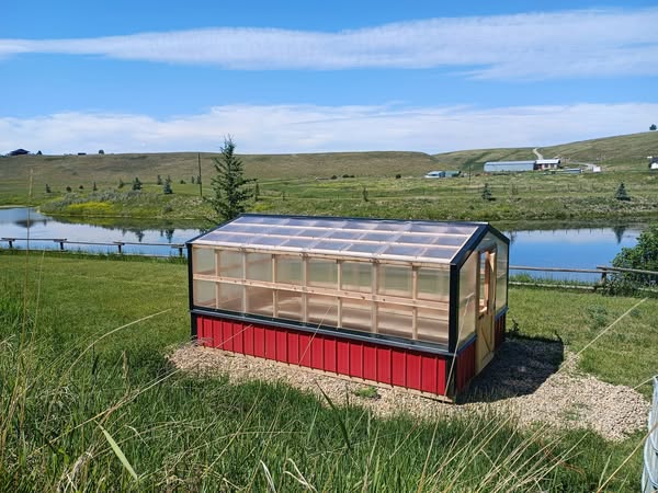 A 10' x 8' greenhouse with a lean-to style roof and garden boxes, delivered to Glenwood.